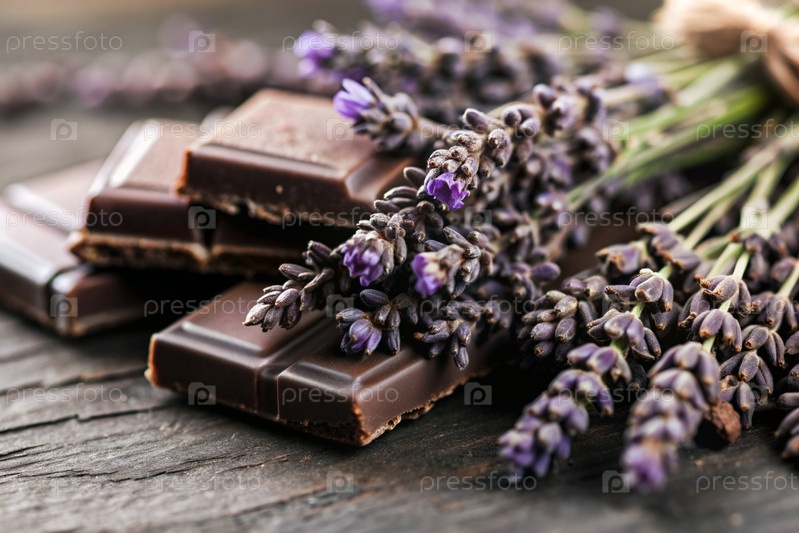 Кусочки шоколада с веточками лаванды для десерта на деревянном фоне