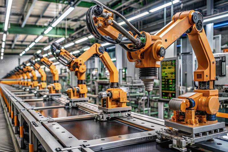 Автоматизированное производство электронных устройств. Современные роботизированные манипуляторы на сборочной линии чипов и печатных платок на современном электротехническом заводе. Установка компонентов на доске