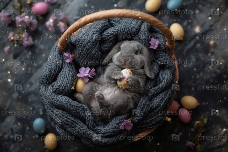 Пасхальный кролик держит пасхальное яйцо в лапах, лежит на спине на сером вязанном одеяле и смотрит в камеру