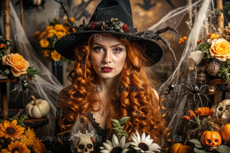 Концепция Хэллоуина. Ужасное. Костюмированная вечеринка. Красивая женщина в костюме ведьмы. Баннер, открытка