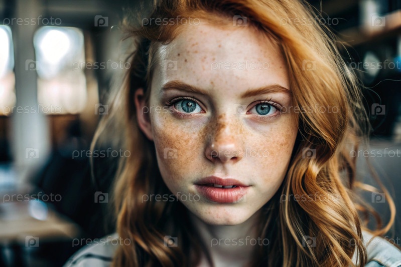 Глубокий эмоциональный портрет.Лицо молодой девушки без макияжа, с выразительными глазами, кудрявыми красными волосами и веснушками на лице. Естественная женская красота