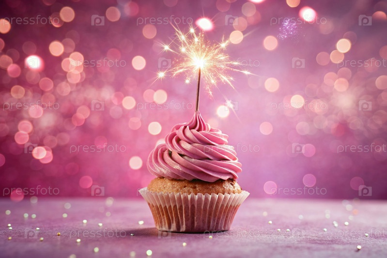 Праздничный кекс с блеском на ярко-розовом фоне со ленточками, идеально подходит для веселых празднований
