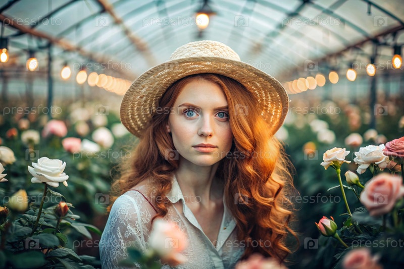 Портрет красивого садовника с рыжими волосами в соломенной шляпе, работающего с розами в стеклянной теплице
