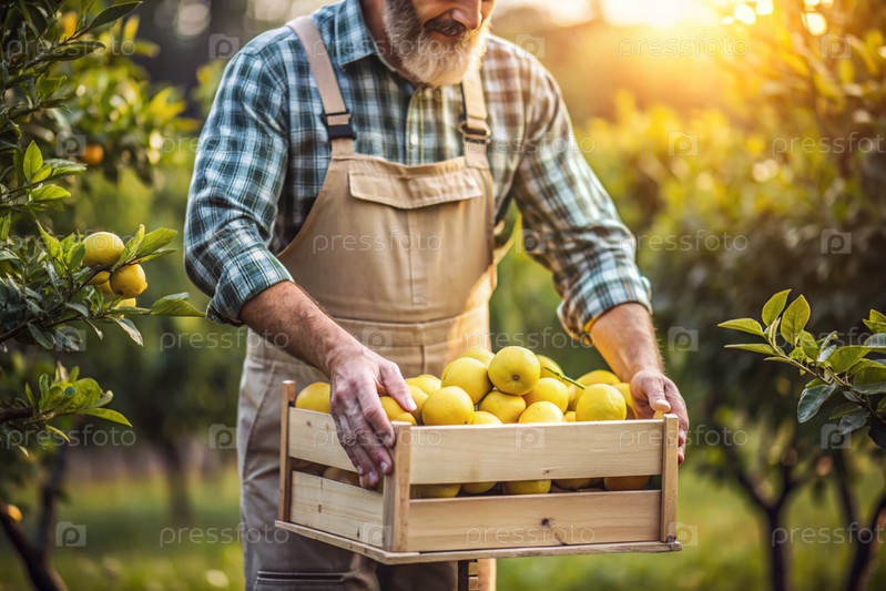 Сельскохозяйственная промышленность. Деревянный ящик с лимонами в руках фермера. Садовник собирает богатый урожай. Ближе, солнечный свет. Осенний плодовый сбор