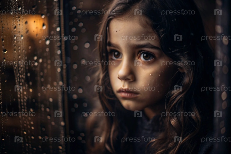 Девушка-подросток с грустным лицом у окна. снаружи идет дождь. понятие одиночества, депрессии, меланхолии, обиды и плохого настроения