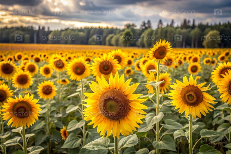 Красивое поле цветущих подсолнечников на фоне размытого золотистого заката. Коллекция семян подсолнечника, семечек подсолнечника, солнечной масла