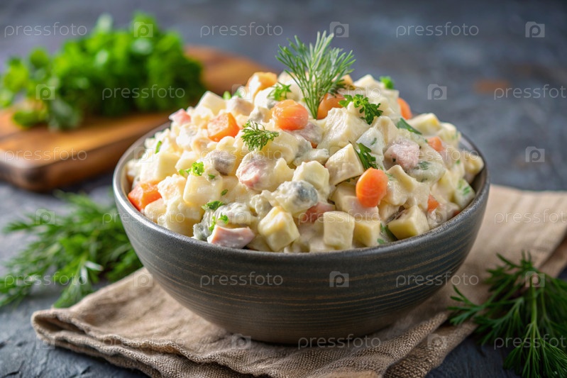 Традиционный русский салат Оливье для празднования на тарелке на деревянной столешнице. генератив AI