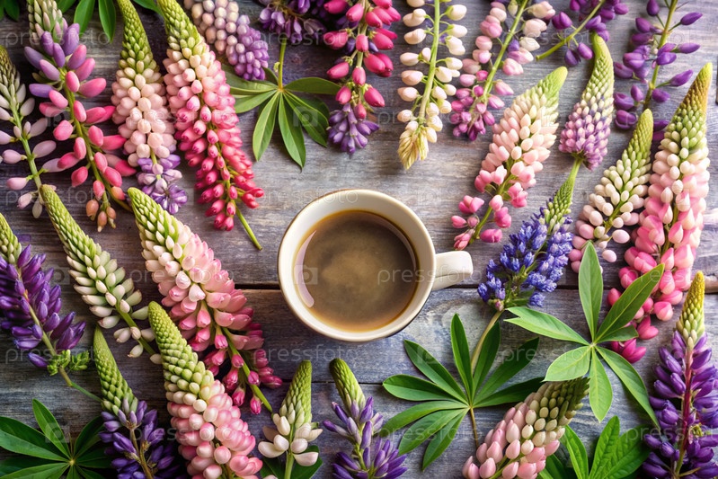 Приятная открытка. чашка кофе с тарелкой и люпиновыми цветами. красивая натюрморт. весна, лето. доброе утро концепция