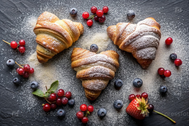 Вкусные свежевыпеченные кроассанты и ягоды в форме сердца на тёмном фоне сланцевого камня. французский завтрак. хорошие ближневые выпечки. пекарня со вкусным хлебом. кондитерские изделия