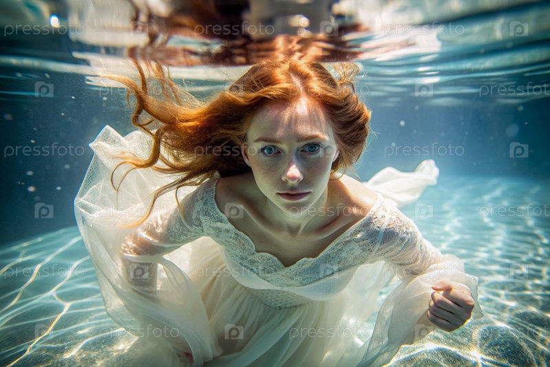 Портрет красивой рыжеволосой девушки в модном белом платье под водой на глубине