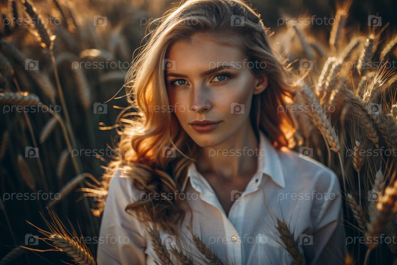 Молодая девушка в белой рубашке с золотыми волосами стоит на поле спелой золотистой пшеницы при закате солнца.Урожай, сельская природа и жизнь