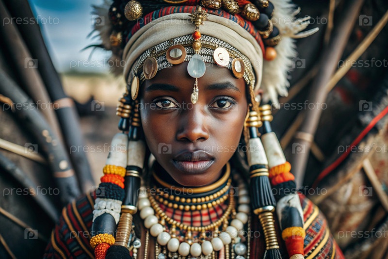 Красивая африканская девушка в традиционном национальном костюме. с костями. портрет символизирует традиции, культуру и красоту африканского народа