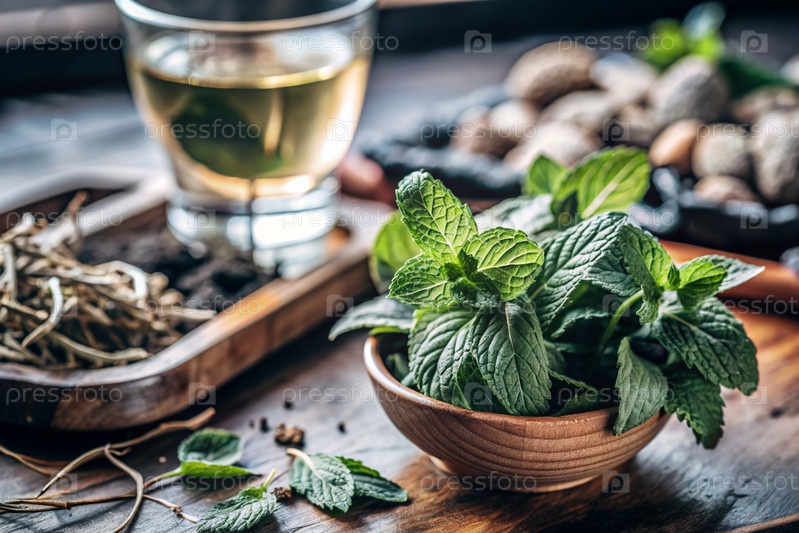 Закрытие зеленых листьев мяты. Листья с заметными венами и текстурой. Мента, бальзам для приготовления чая. Травяной чай для нервной системы
