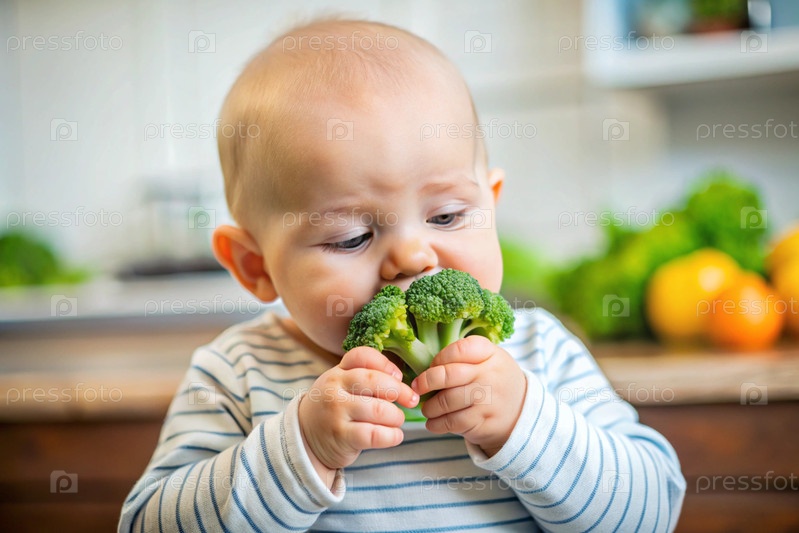 Здоровое детское питание. Первая еда. Кормить ребенка. Милый ребенок ест брокколи. Свежие овощи и фрукты