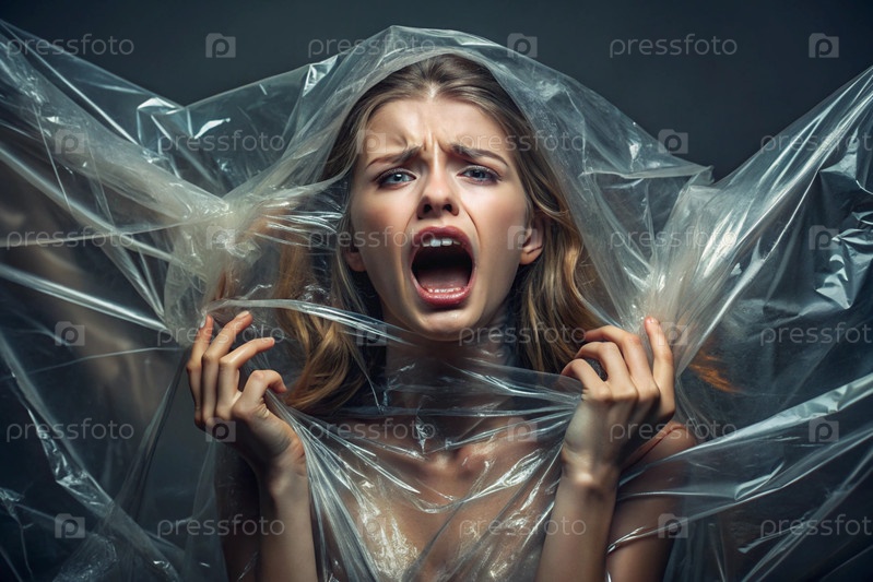 Девочка завернута в целлофан или сумку. Девушка задыхается. Пластиковое загрязнение планеты. Опасность для окружающей среды. Сокращение повторного использования пластика. Переработка. Концепция мусора