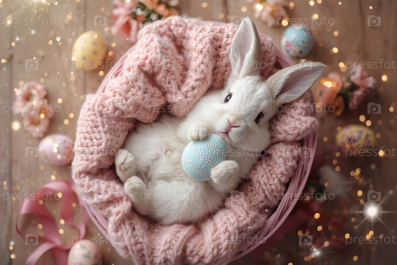 Пасхальный кролик пасхальное яйцо в лапах, лежащее на спине на сером вязанном одеяле в корзине из колючки и уставившееся в камеру