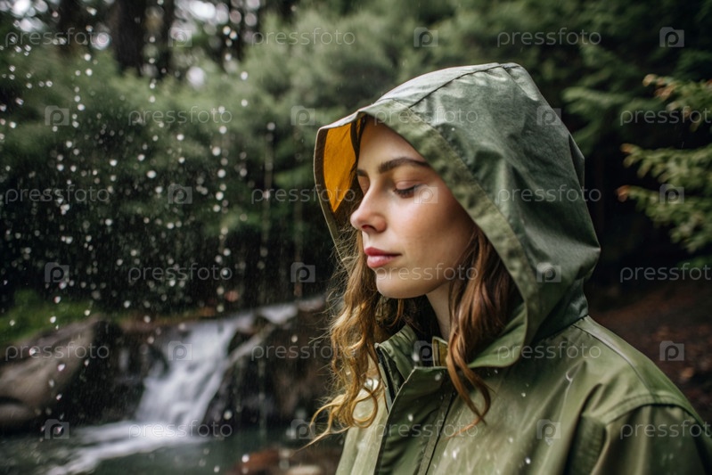 Счастливая молодая женщина в плаще наслаждается дождем на фоне зеленого леса, концепцией наслаждения естественной спокойной жизнью, окружающей средой, образом жизни