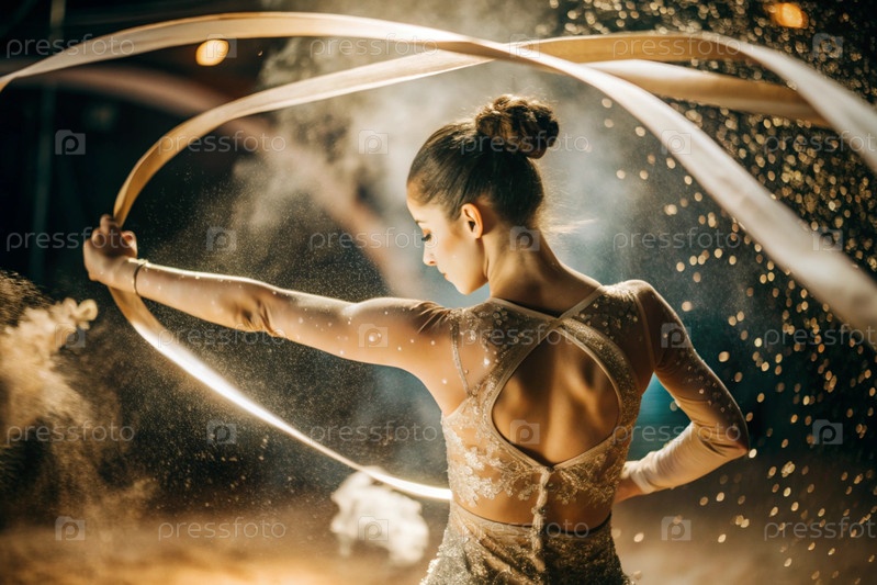 Ритмическая гимнастика - это крупный план красивой гимнастки с лентой в центре внимания на спортивной арене