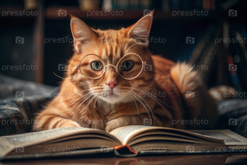 Красивая, большая рыжая кошка с модными круглыми очками для чтения лежит на деревянном столе со своей книгой