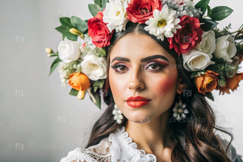 Портрет красивой молодой женщины в крупном плане с цветочной тиарой или венком на голове на белом фоне. испанская культура, латиноамериканское наследие