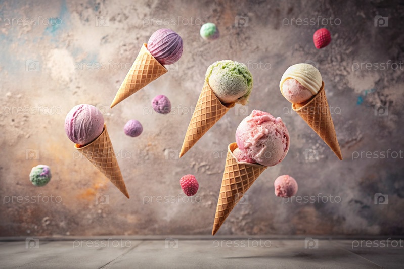 сладкий, холодный десерт. сливочное ванильное мороженое с различными вкусами в конусах пластинок. баннер, реклама. Всемирный день мороженого. сладкий десерт