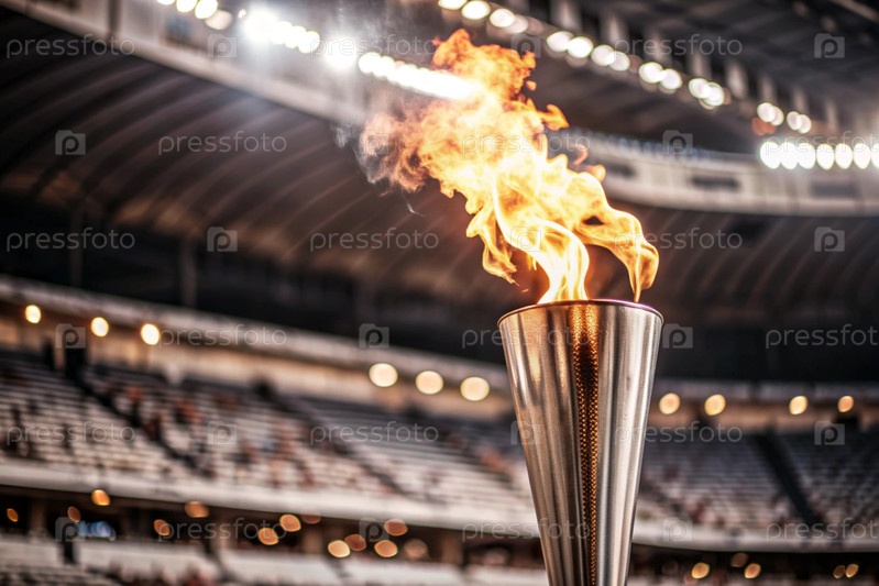 Пламя олимпийского факела горит на фоне спортивного стадиона, арены и красивой размытой стороны