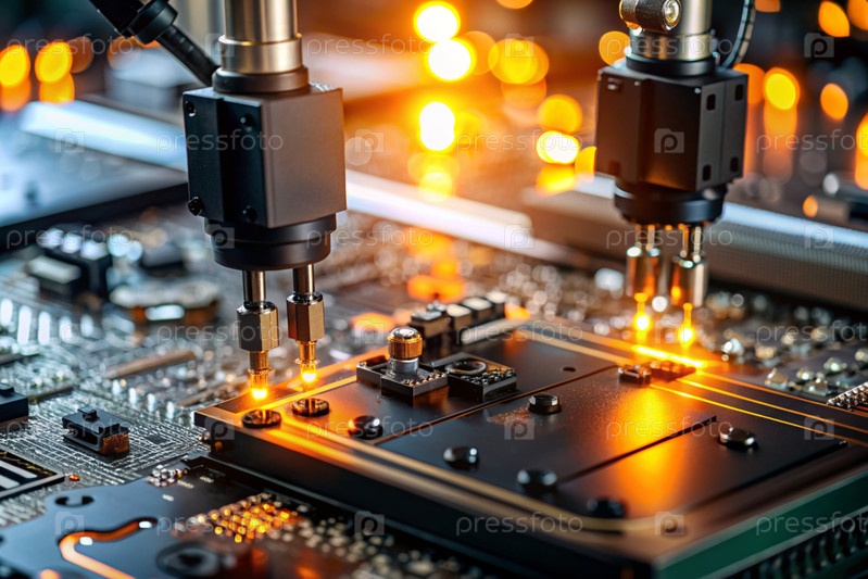 Автоматизированное производство электронных устройств. Современные роботизированные манипуляторы на сборочной линии чипов и печатных платок на современном электротехническом заводе. Установка компонентов на доске