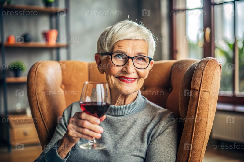 Современная, стильная пожилая женщина с короткими волосами со стаканом красного вина на стуле в гостиной дома