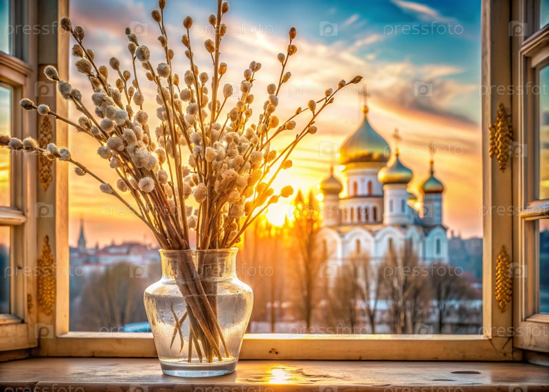 Большой план букета ивы в стеклянной вазе на фоне древнего белого окна с видом на золотые куполы храма и заходящее солнце