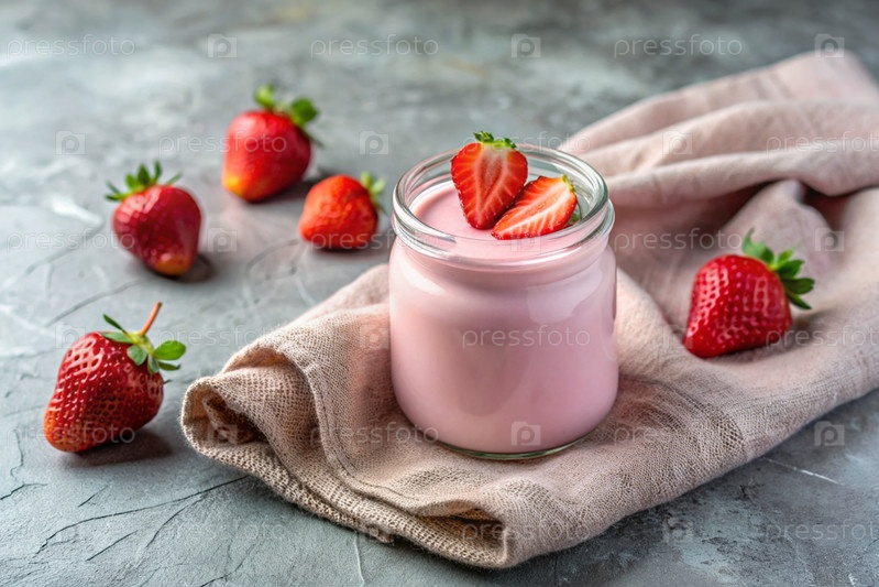 Домашний клубничный йогурт со свежими ягодами, винтажной ложкой и полотенцем на стильном сером фоне