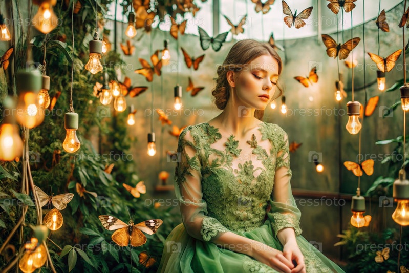 Портрет красивой девушки в зеленом платье среди многих подвешенных лампочек и бабочек, размахивающих вокруг нее