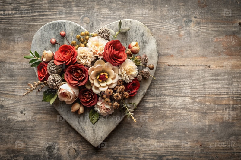Открытка, баннер Дня матери с красными цветами, сердца на винтажном сером деревянном фоне