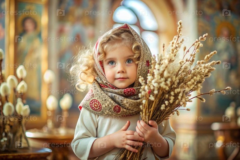 Пальмовое воскресенье. христианство. портрет трехлетней девочки в русском народном шале с ветвями ивы в руках на фоне православной церкви