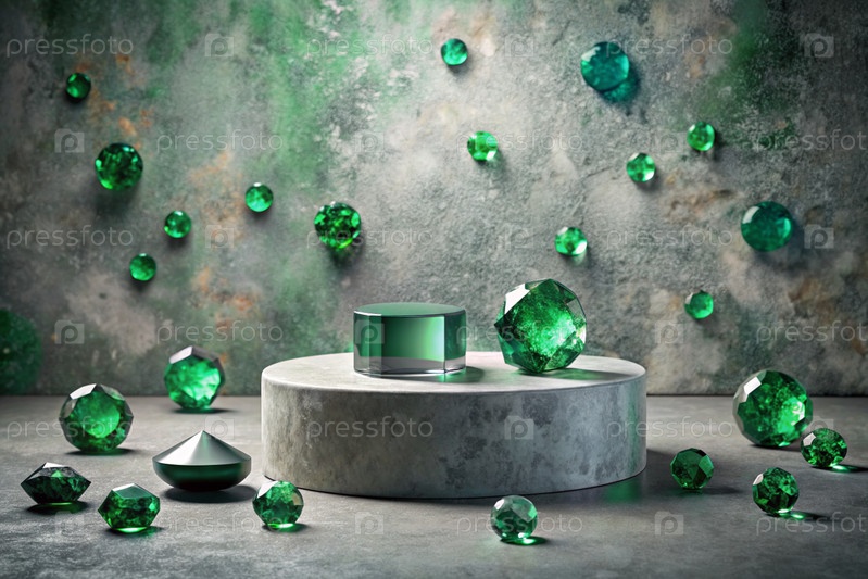 Минималистский фон для демонстрации ювелирных изделий. Современная пустая трибуна с серой стеной и изумрудами. Креативный дизайн презентации продукта