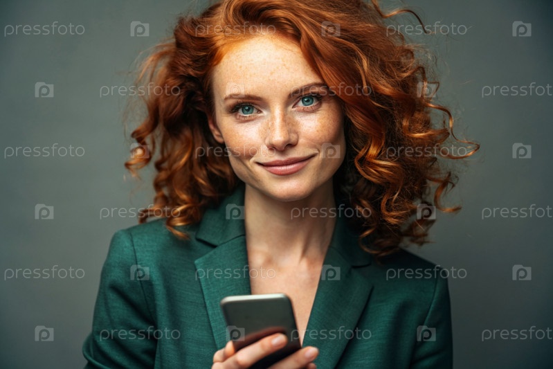 Деловая женщина с локонами красных волос и веснушками. Она одета в обычное зеленое пиджак. В руках смартфон. Небольшой бизнесмен смотрит на свой мобильный телефон