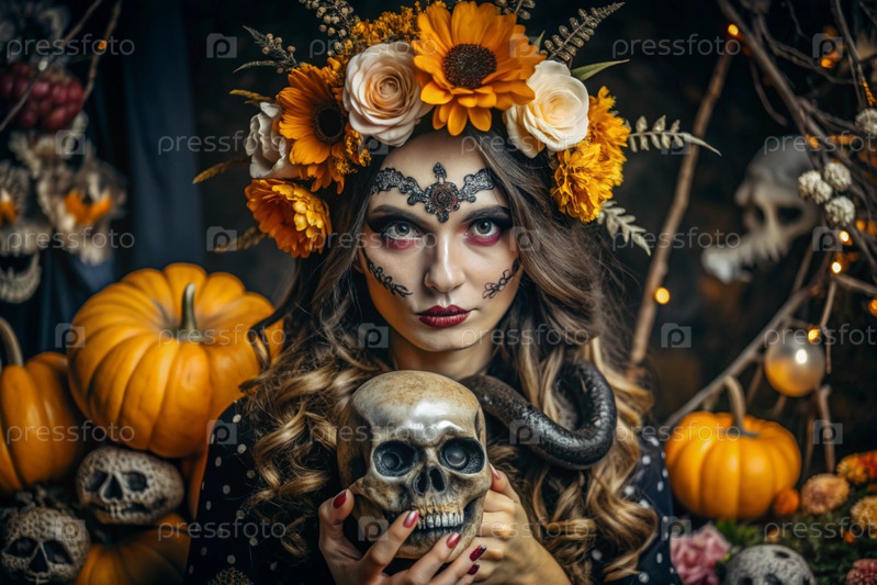 Концепция Хэллоуина. Ужасно. Костюмированная вечеринка. Красивая женщина с покрашенным черепом на лице и цветами на голове. Баннер, открытка