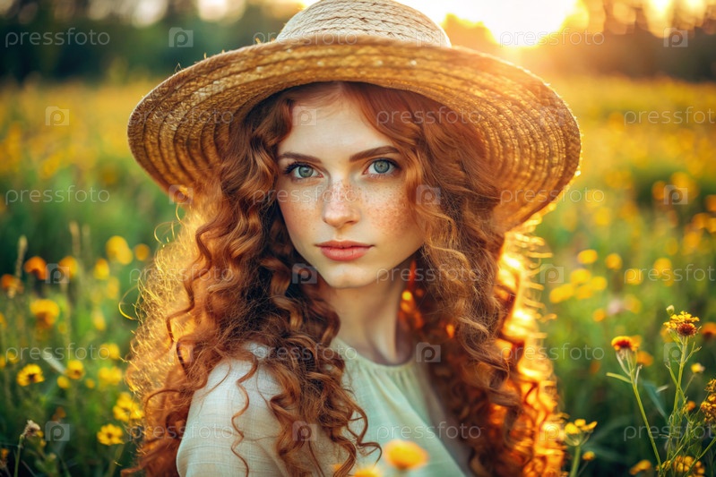 Портрет красивой кудрявой девушки в соломенной шляпе на цветочном поле.Девушка позирует и смотрит в камеру