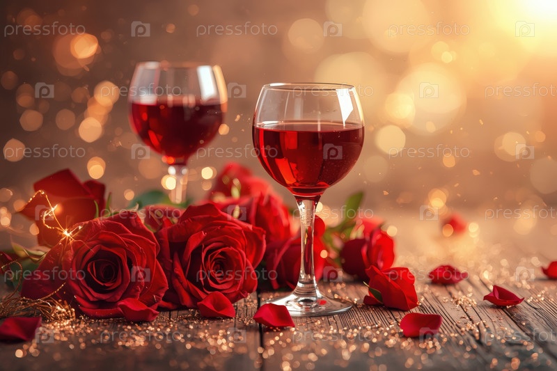 Концепция Дня Святого Валентина: два бокала красного вина, шоколад в окружении красных цветов и сердца на День святого Валентина