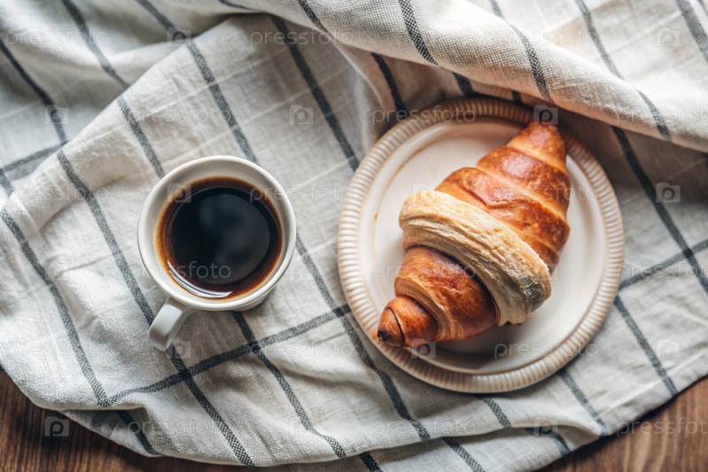 Вкусный свежевыпеченный кроассан, чашка белого кофе и хлопчатобумажная салфетка на деревянном фоне. французский завтрак. вкусная выпечка вблизи