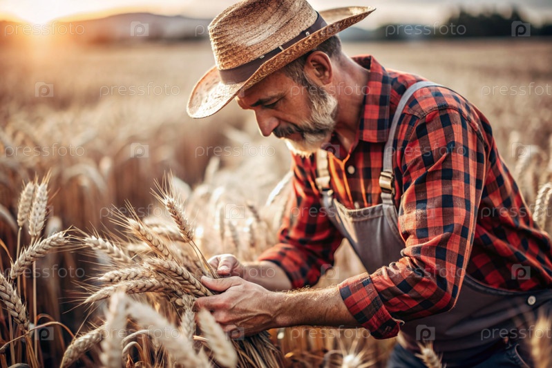 Фермер-мужчина держит золотые колосья пшеницы на фоне созревающего поля. Близкий план фермера. Концепция посадки и сбора богатого урожая. Сельский пейзаж при закате солнца