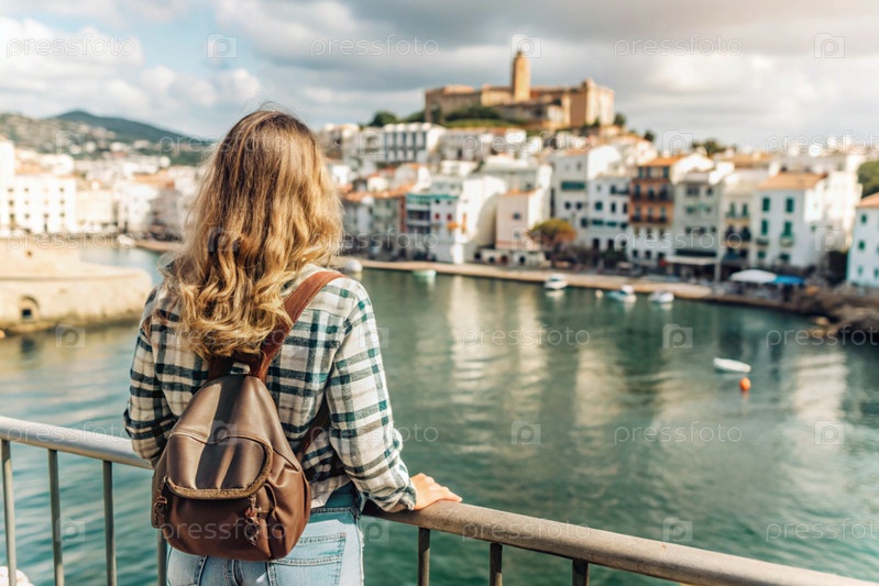 Девушка-путешественница с рюкзаком на фоне южного побережья моря. она путешествует и наслаждается жизнью и окружающей средой. туризм