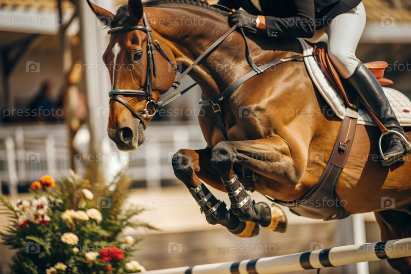 Близкий план олимпийской лошади и всадника, перепрыгивающих через препятствие на открытой арене - это конная езда