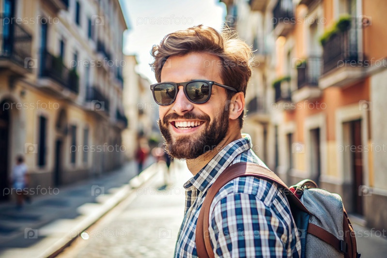 Портрет счастливого красивого хипстера-путешественника с рюкзаком и солнцезащитными очками. Сольное путешествие, образ жизни. Молодой турист наслаждается отдыхом в солнечный день