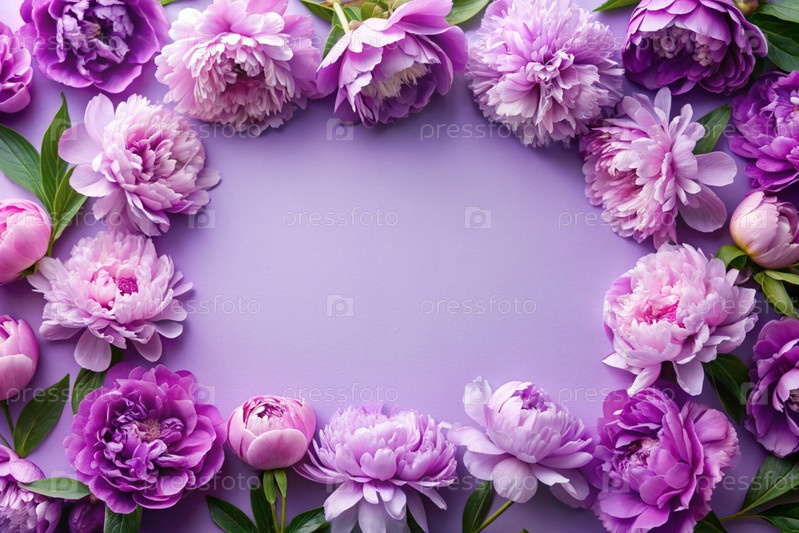 Рама с красивыми цветками пиони на пастельно-фиолетовом фоне