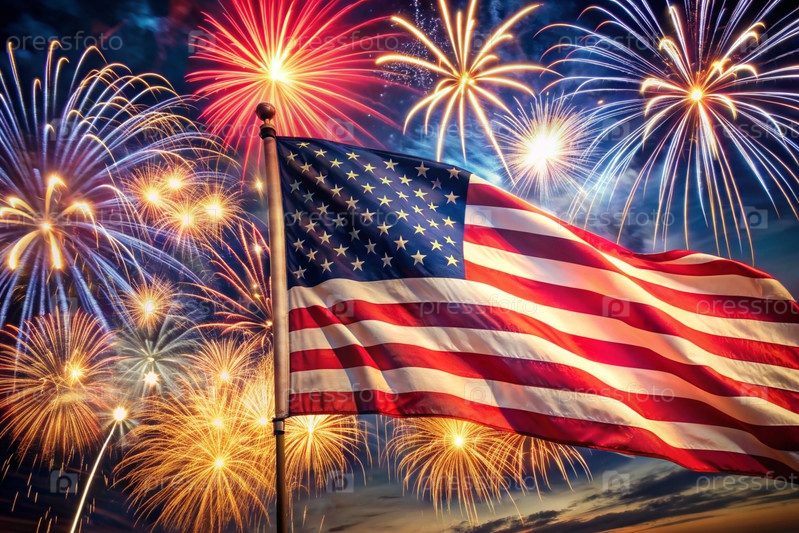 Флаг США с фейерверком в небе День независимости - 4 июля под открытым небом