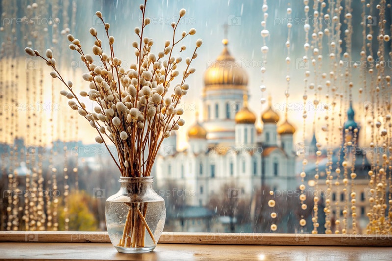 Большой план букета ивы в стеклянной вазе на фоне древнего белого окна с видом на золотые куполы храма и заходящее солнце