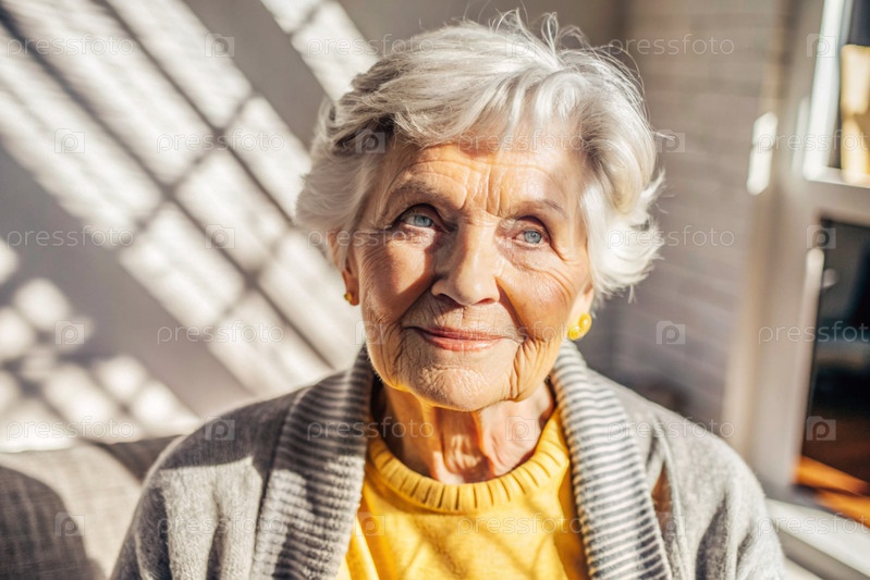Минимализм.Студийный портрет стильной, элегантной пожилой женщины, 70-летнего пенсионера в интерьере и одежде спокойных тонов.Концепция пожилых людей