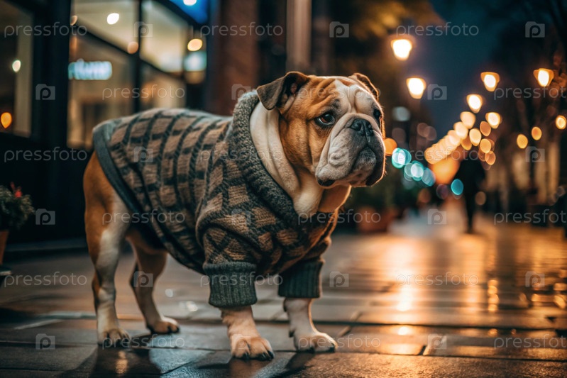 Любимый питомец - красивый английский бульдог в вязанном теплом комбинезоне на прогулке по городу