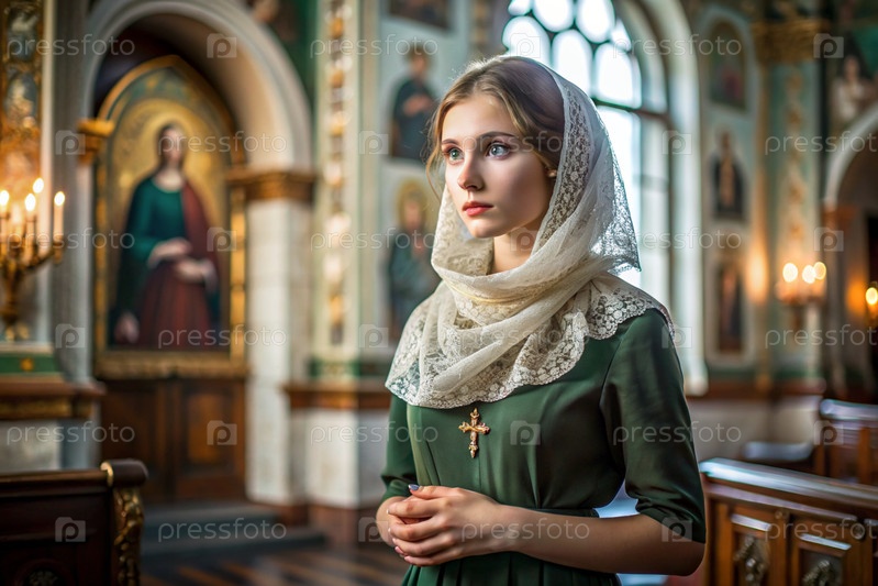 Портрет красивой молодой женщины с платками в православной церкви.Девушка молится в церкви среди икон