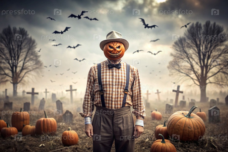 Концепция Хэллоуина. Ужасная. Страх. Устрашающий богий с тыквенной головой, квадратной рубашкой и бабочкой. Баннер, открытка